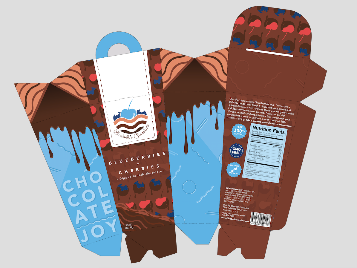 I wanted the front to immediately let people know its a chocolate product. I wanted to use the chocolate covered cherries and blueberries on the flap as well as the front so you can also indicate what it is before reading the text. This style can allow it to be interchangeable with other fruits if this were real. The drips on the side are supposed to give an illusion as if the chocolate was seeping out.